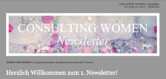 • CONSULTING WOMEN veröffentlicht regelmäßig einen NEWSLETTER. Beratende Kolleginnen können hier ihre Angebote, Termine, Suche/Biete und alle sonstigen Informationen aus ihrem Beratungsfeld veröffentlichen.